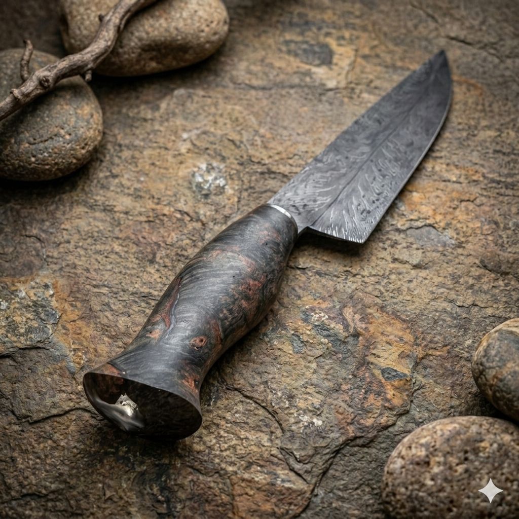 Cada faca Damasco produzida por nós passa por um processo artesanal tradicional, com lâminas forjadas em aço Damasco de altíssima qualidade, oferecendo durabilidade superior, resistência e um padrão de ondulações único que valoriza cada peça. O cabo em madeira burl estabilizada com resina une beleza natural e conforto ergonômico, garantindo um visual sofisticado e toque seguro e firme.